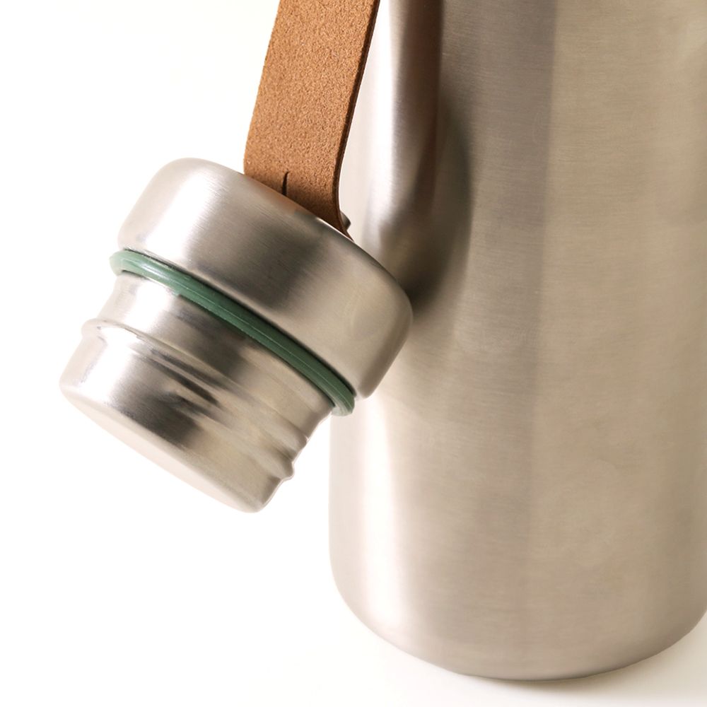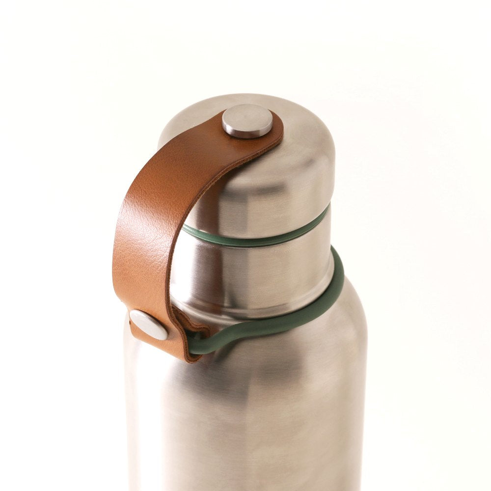 持ち手としても使える、蓋とボトルを繋ぐレザーベルトがポイント。