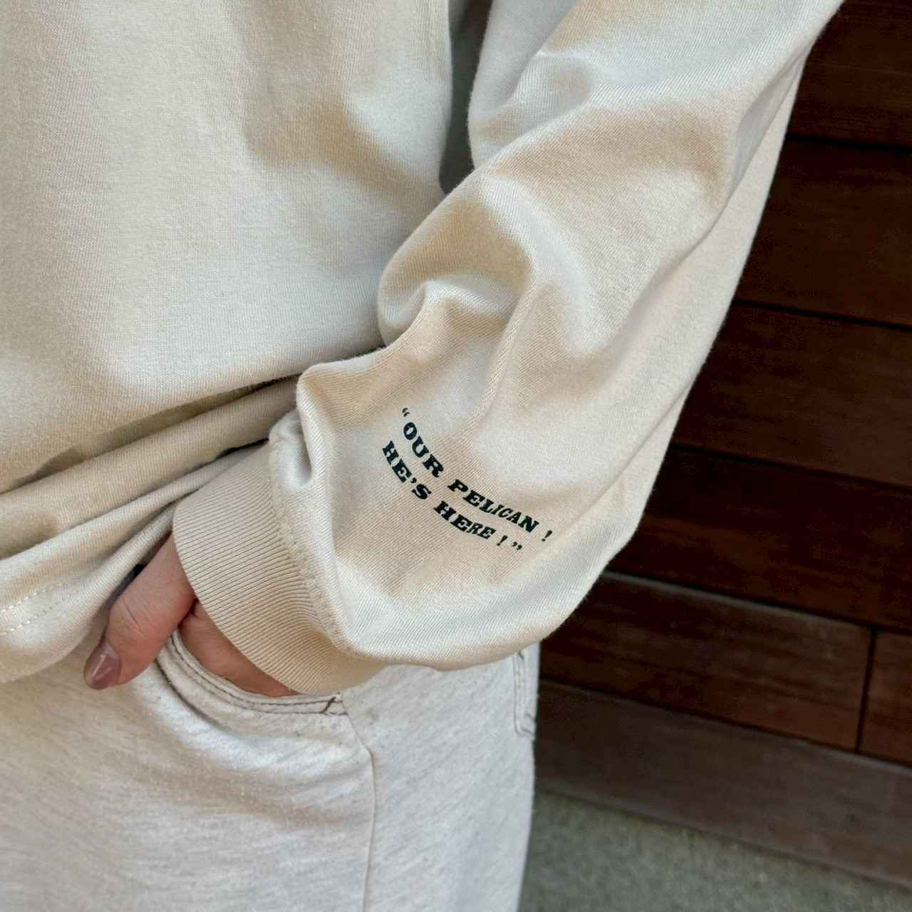 袖口には、遊び心のある「OUR PELICAN! HE'S HERE」のひとことをプリント。
