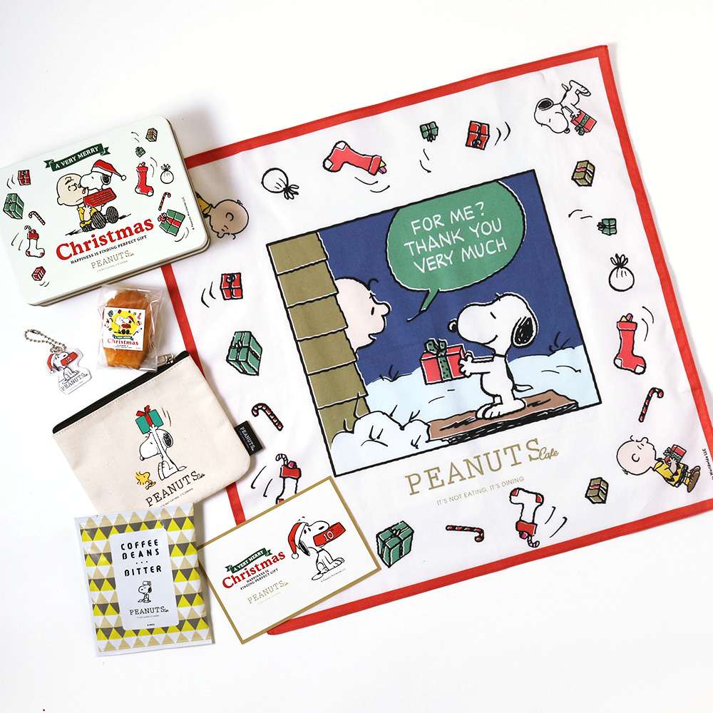 クリスマスのワクワク感をテーマに、スヌーピーと仲間たちをあしらったポーチやハンカチ、マドレーヌ、ドリップコーヒー、アクリルキーホルダーをセットにした、心温まるBOXです。