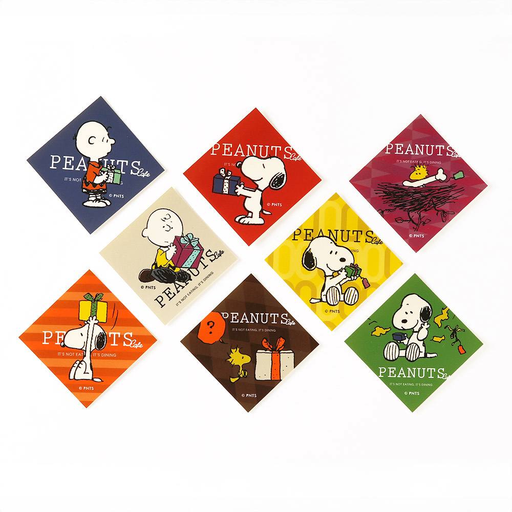 スヌーピーと仲間たちが施された全4種類のパッケージで、ステッカーが全8種類のうち1枚がランダムに。